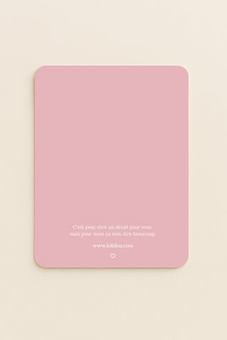 Parce que parfois, quelques mots suffisent à réchauffer le cœur ou à éclairer une journée, ajoutez une touche personnelle à vos bijoux avec une jolie carte, sur laquelle vous pouvez écrire un petit mot (ça fait toujours plaisir).