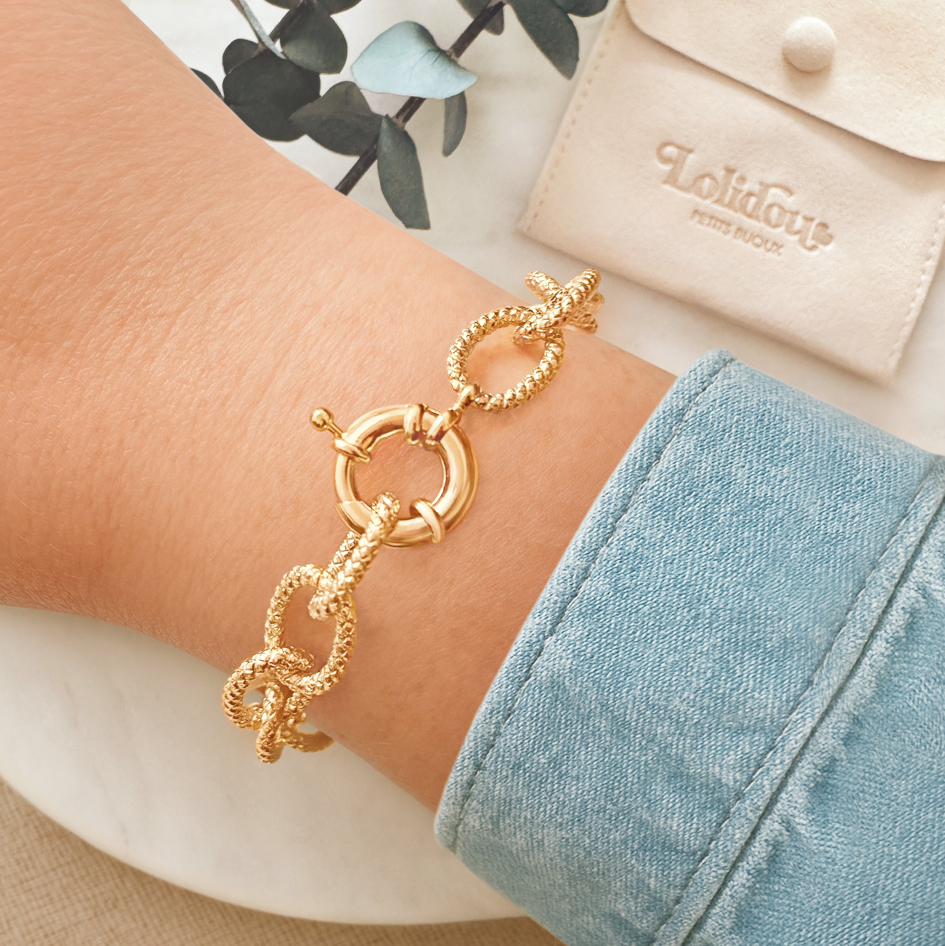 Découvrez la puissance de l'élégance avec le Bracelet "Elliot" en plaqué or 3 microns de Lolidou. Sa maille épaisse facettée et son fermoir boué créent un style distinctif. À une longueur de 19 cm, avec une hauteur de maille de 12 mm et un diamètre de fermoir de 17 mm. Résistant à l'eau, au soleil, ne noircit pas.