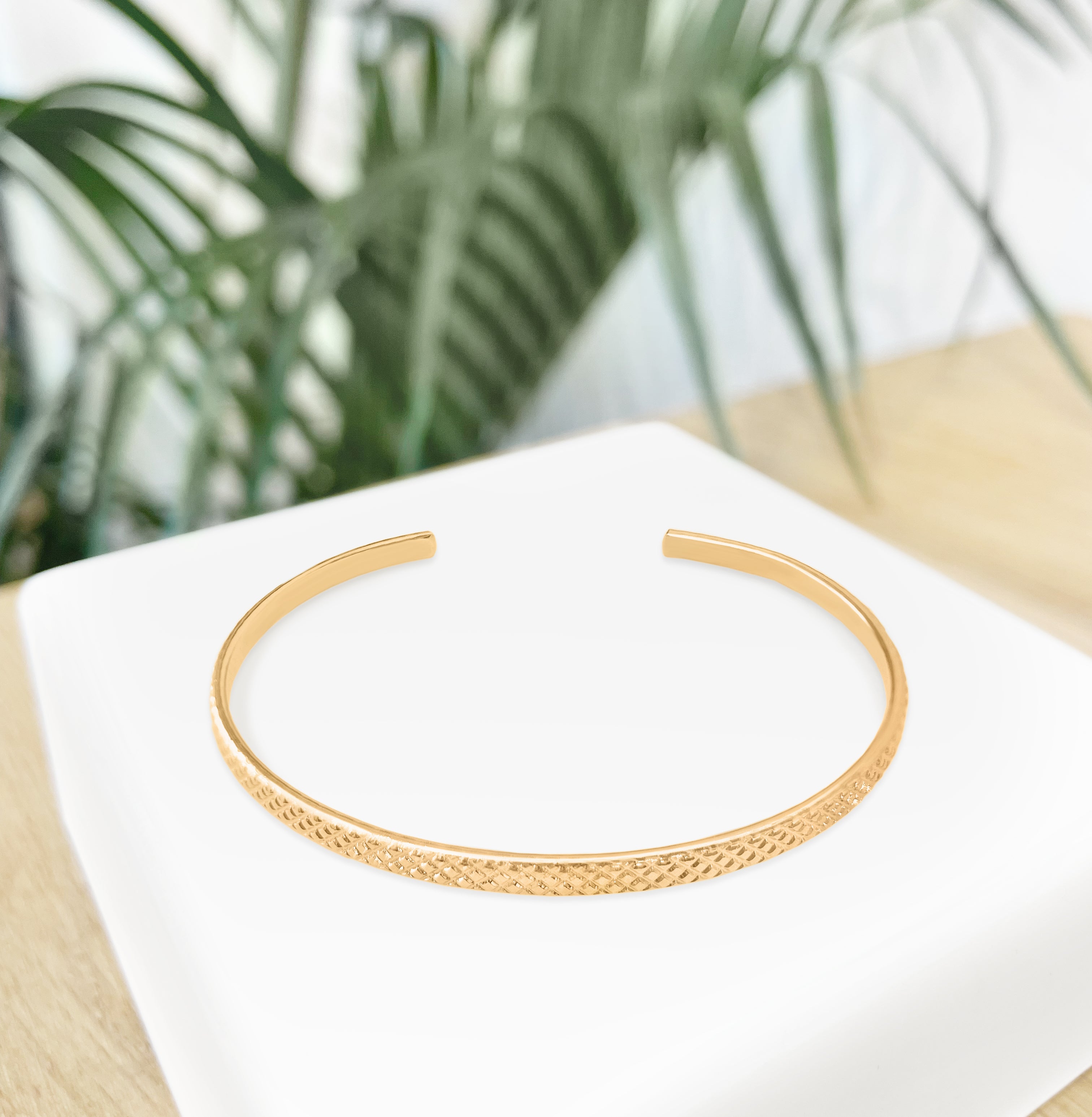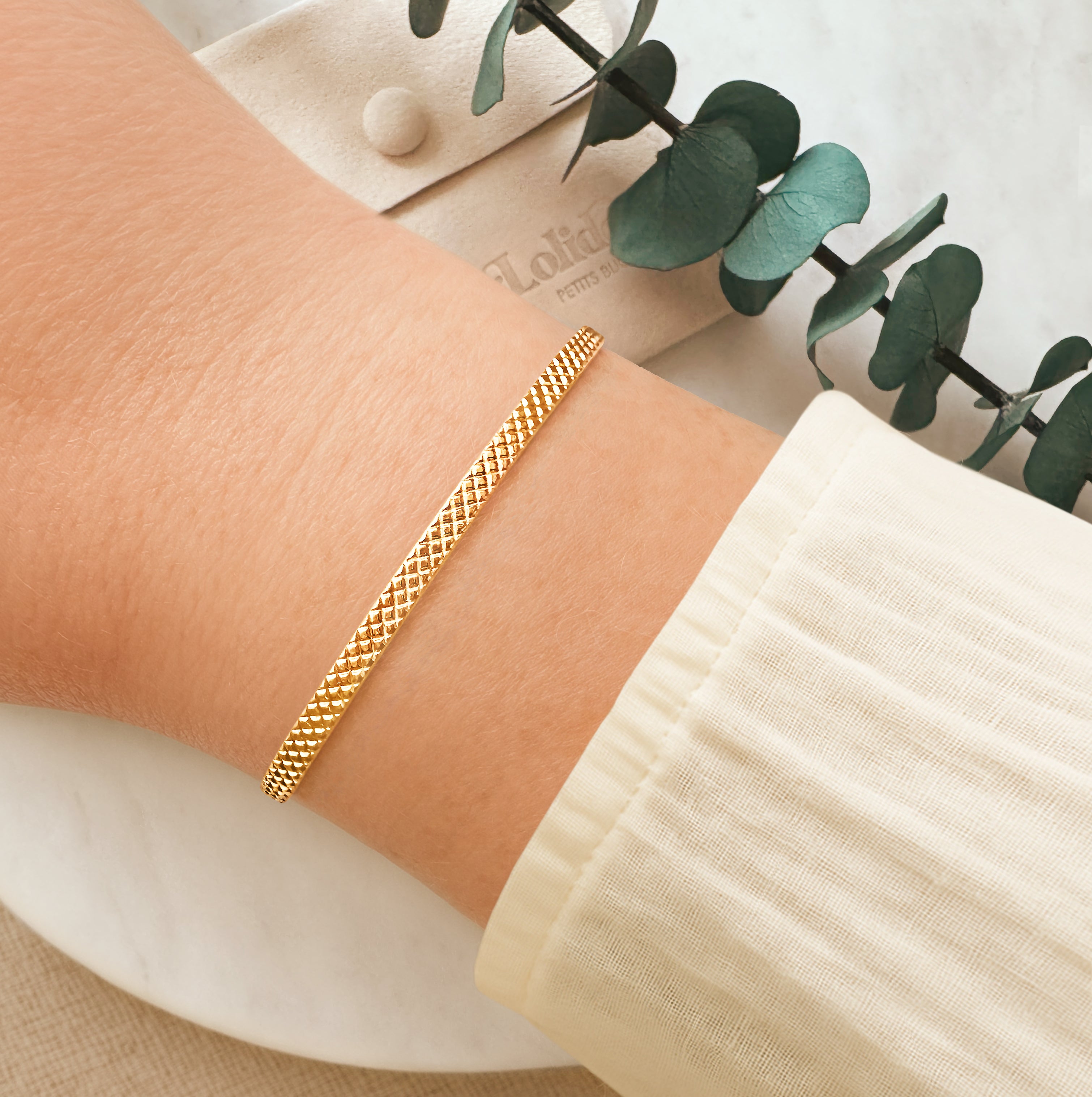 Découvrez le raffinement du Jonc "Jamy" en plaqué or 3 microns chez Lolidou. Son motif croisillons diagonaux, d'une largeur de 3 mm et d'un diamètre de 60 mm, apporte une touche de sophistication. Résistant à l'eau, au soleil, et ne noircit pas.