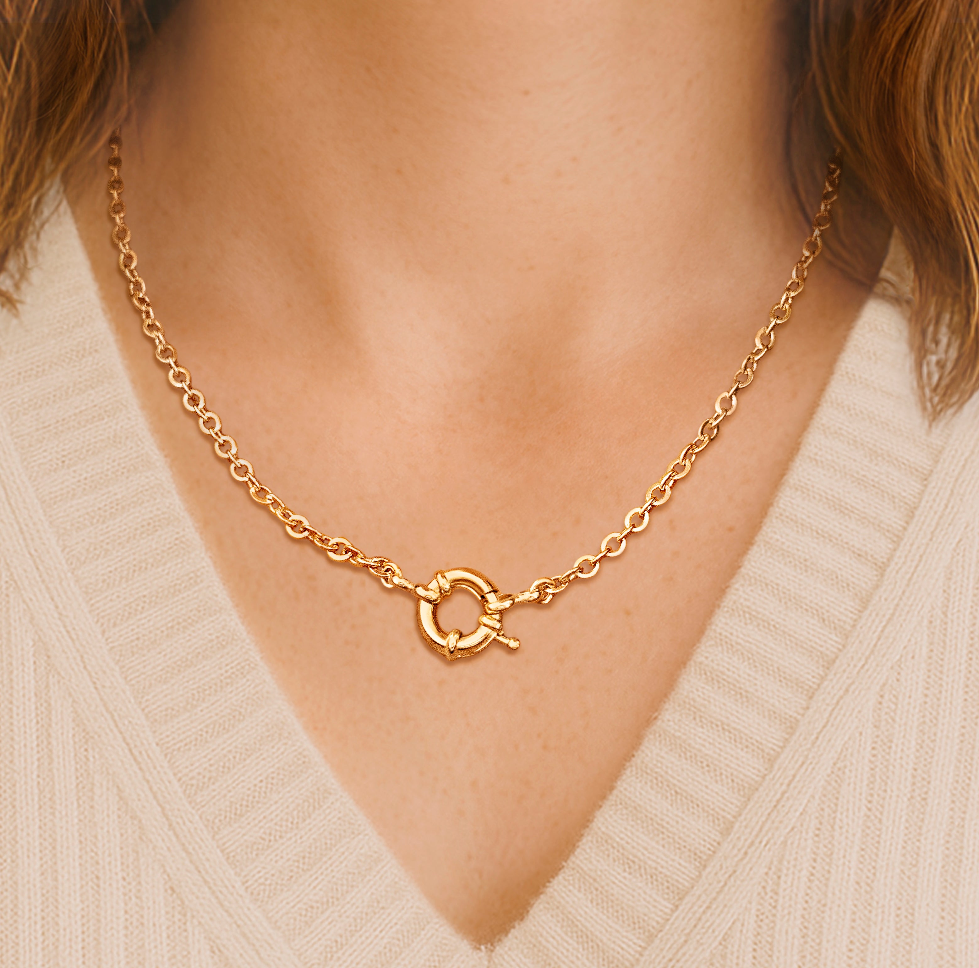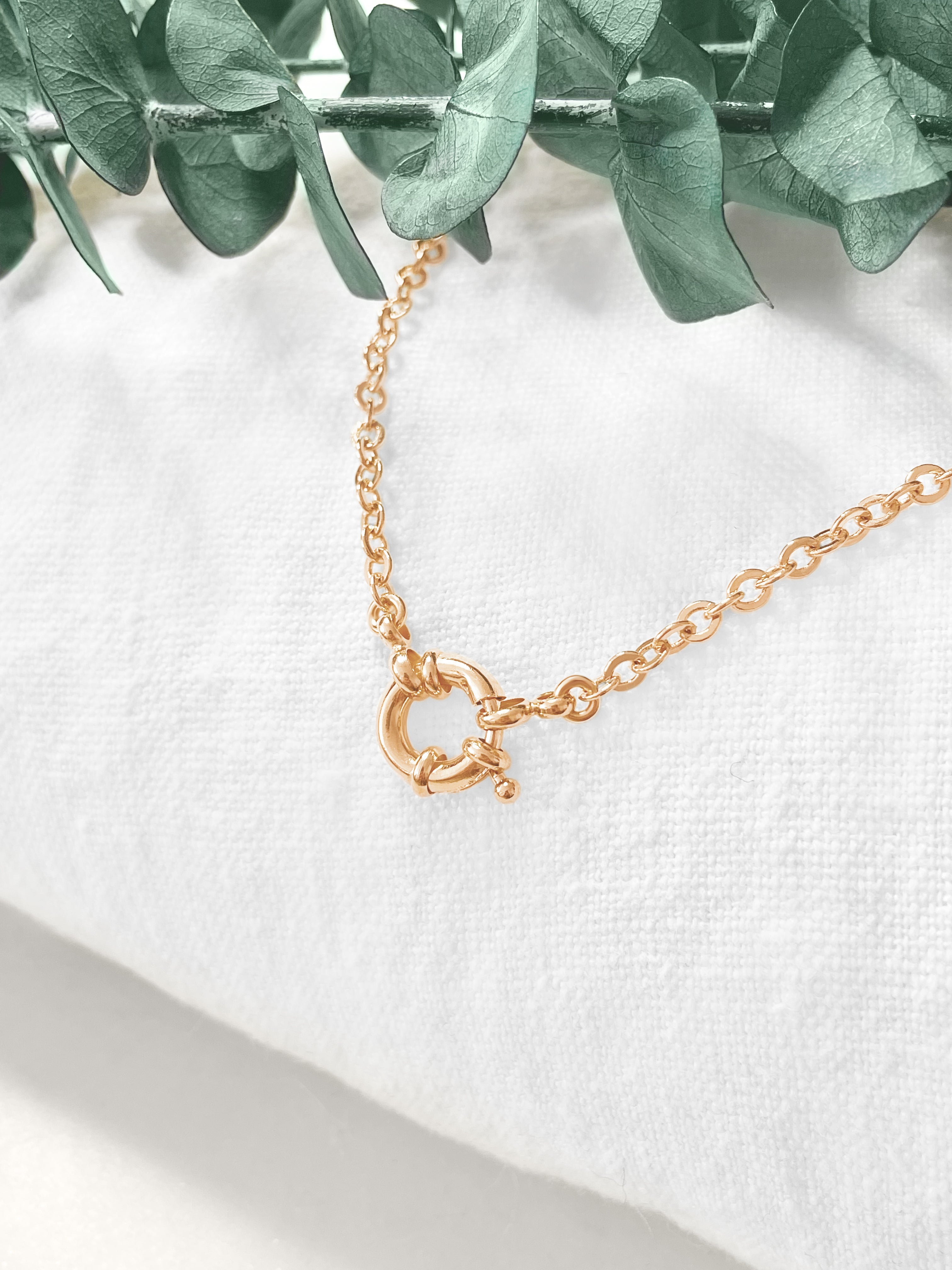 Affirmez votre style avec le Collier "Marin" en plaqué or 3 microns de Lolidou. La chaîne épaisse de 45 cm est ornée d'un fermoir bouée de 12 mm de diamètre. Une déclaration audacieuse pour sublimer votre cou avec une touche maritime. Résistant à l'eau, au soleil, et ne noircit pas.