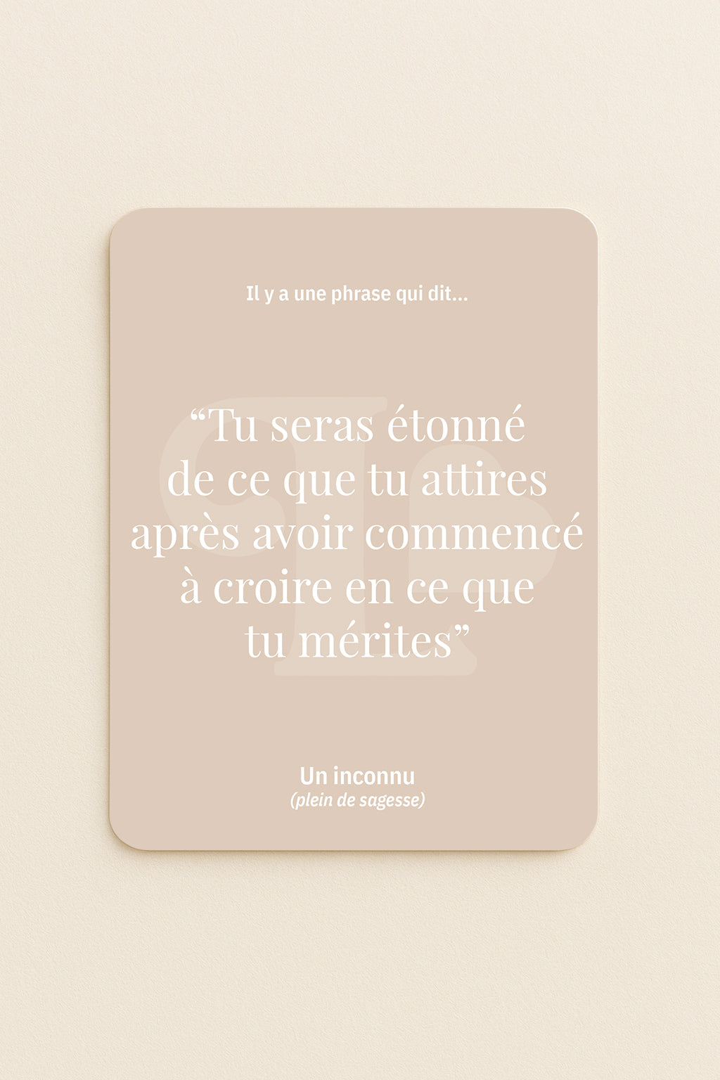 Faites passer un message fort et universel avec notre carte " Ce que tu mérites ". Parfait pour accompagner un bijou, sublimer un cadeau ou simplement envoyer une belle dose d'inspiration.