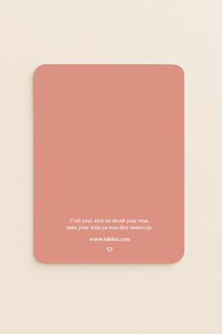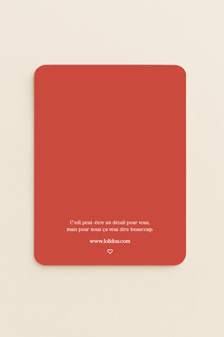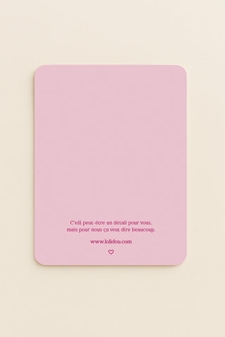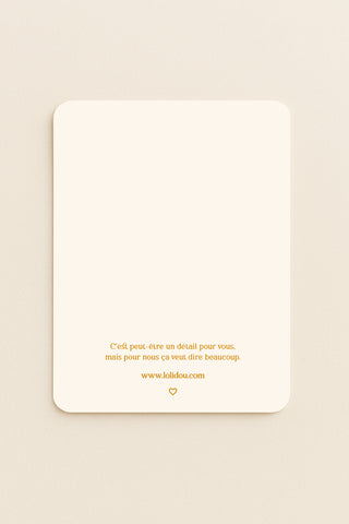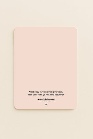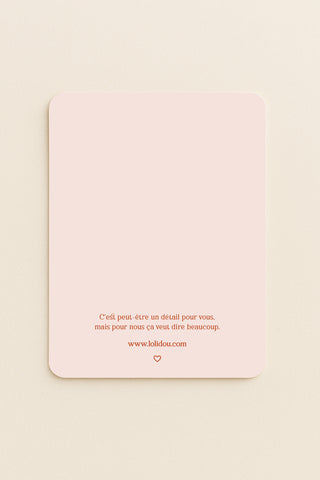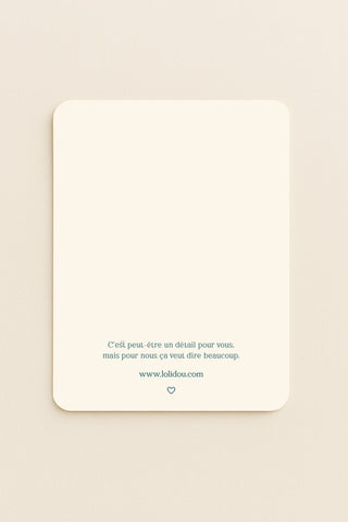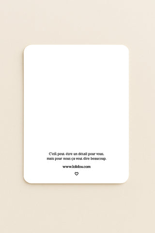 Parce que parfois, quelques mots suffisent à réchauffer le cœur ou à éclairer une journée, ajoutez une touche personnelle à vos bijoux avec une jolie carte, sur laquelle vous pouvez écrire un petit mot (ça fait toujours plaisir).
