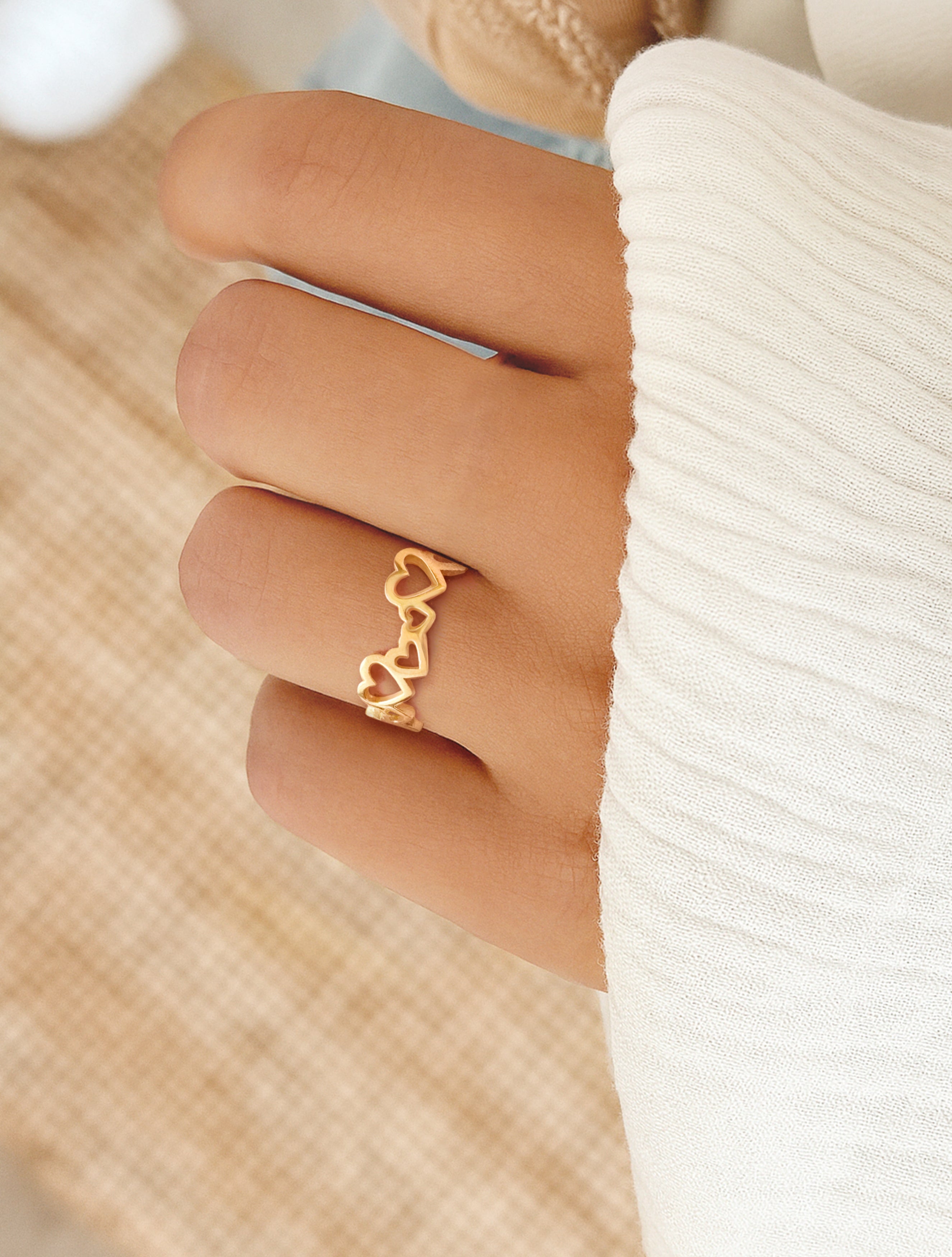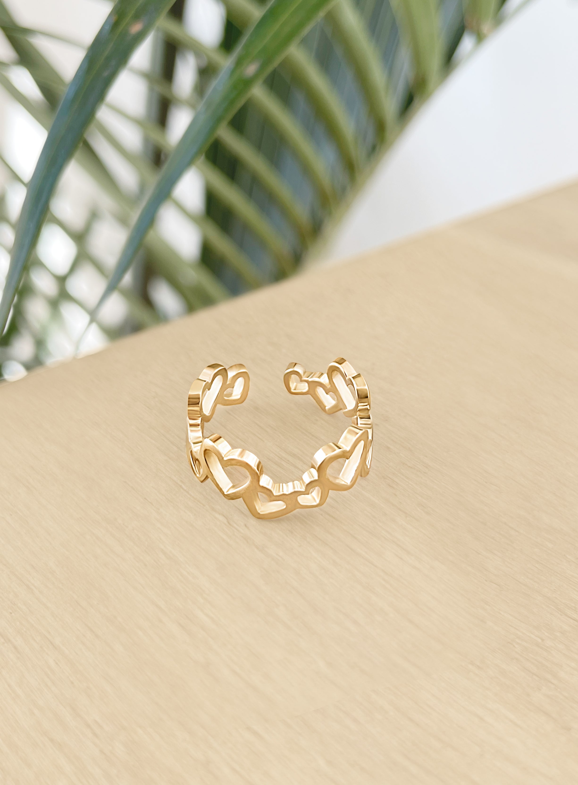 Célébrez l'amour avec la Bague "Aurore" en plaqué or 3 microns de Lolidou. Son motif de cœurs ajourés évoque la délicatesse et la romance. Ajustable de la taille 47 à 54, elle résiste à l'eau, au soleil, et ne noircit pas. Hauteur du corps de la bague : 7 mm.