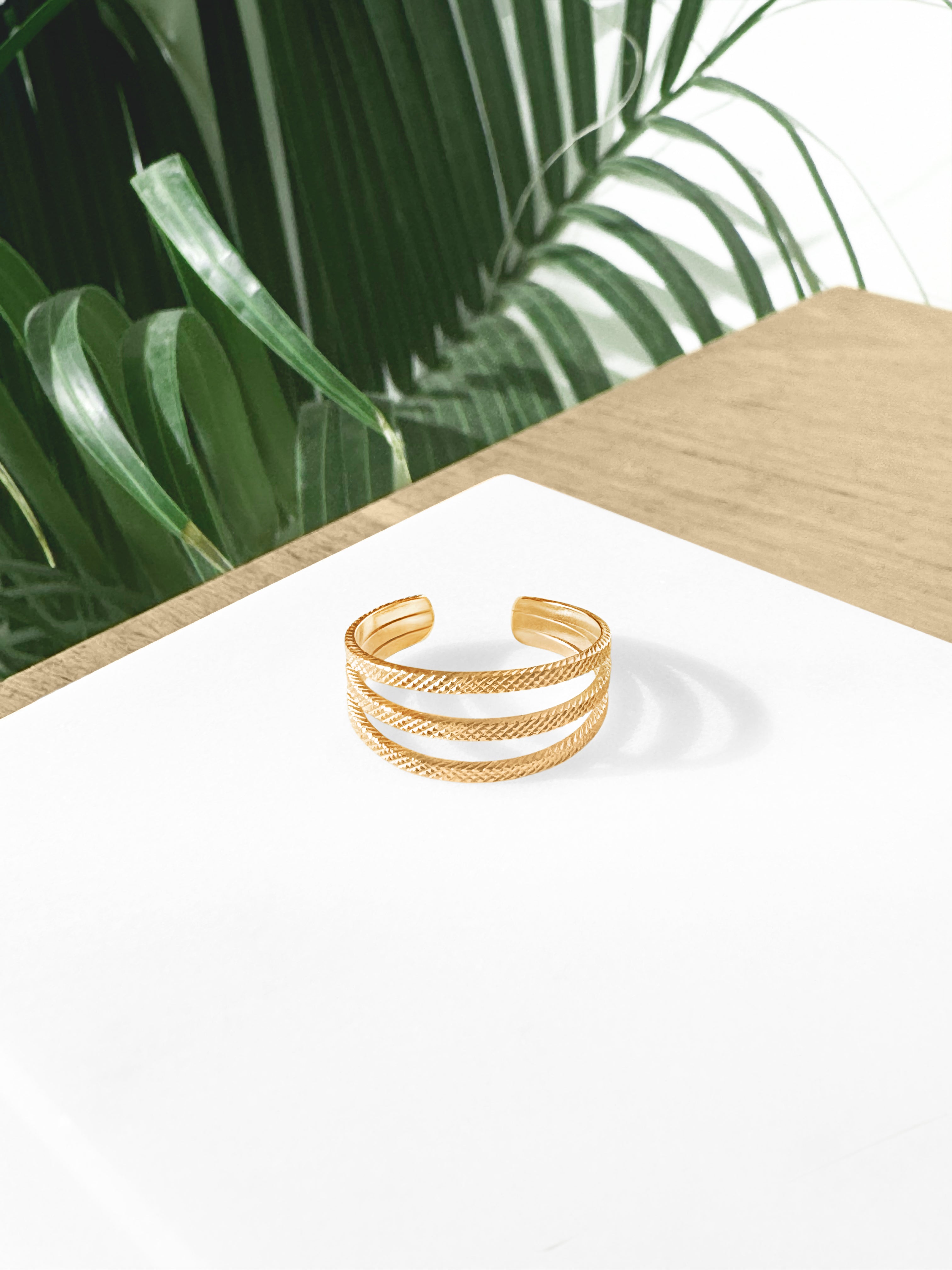 La Bague "Rébécca" en plaqué or 3 microns de Lolidou. Cette bague se distingue par son design strié à triple trait, apportant texture et élégance à ce bijou raffiné. Les fines lignes gravées créent un effet visuel subtil et moderne, réhaussant l'éclat de l'or. Ajustable de la taille 50 à 57, elle résiste à l'eau, au soleil, et ne noircit pas. Hauteur du corps de la bague : 10 mm.