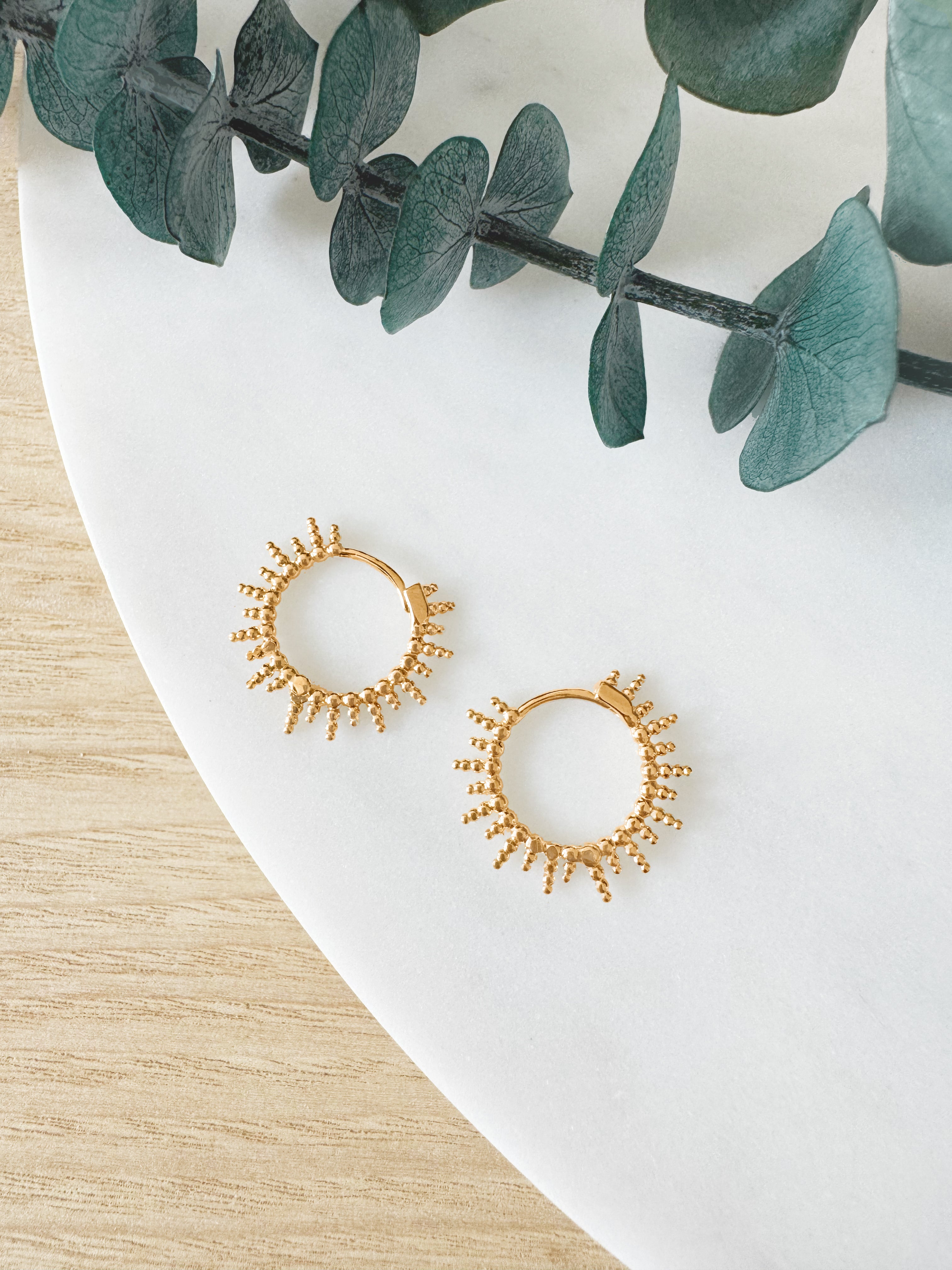 Les boucles "SUN" en plaqué or rayonnent avec leur design solaire et leurs détails perlés, pour une touche d’éclat qui illumine chaque tenue. Avec leur diamètre de 18 mm, elles offrent le parfait équilibre entre finesse et caractère. Un petit soleil à porter au quotidien.