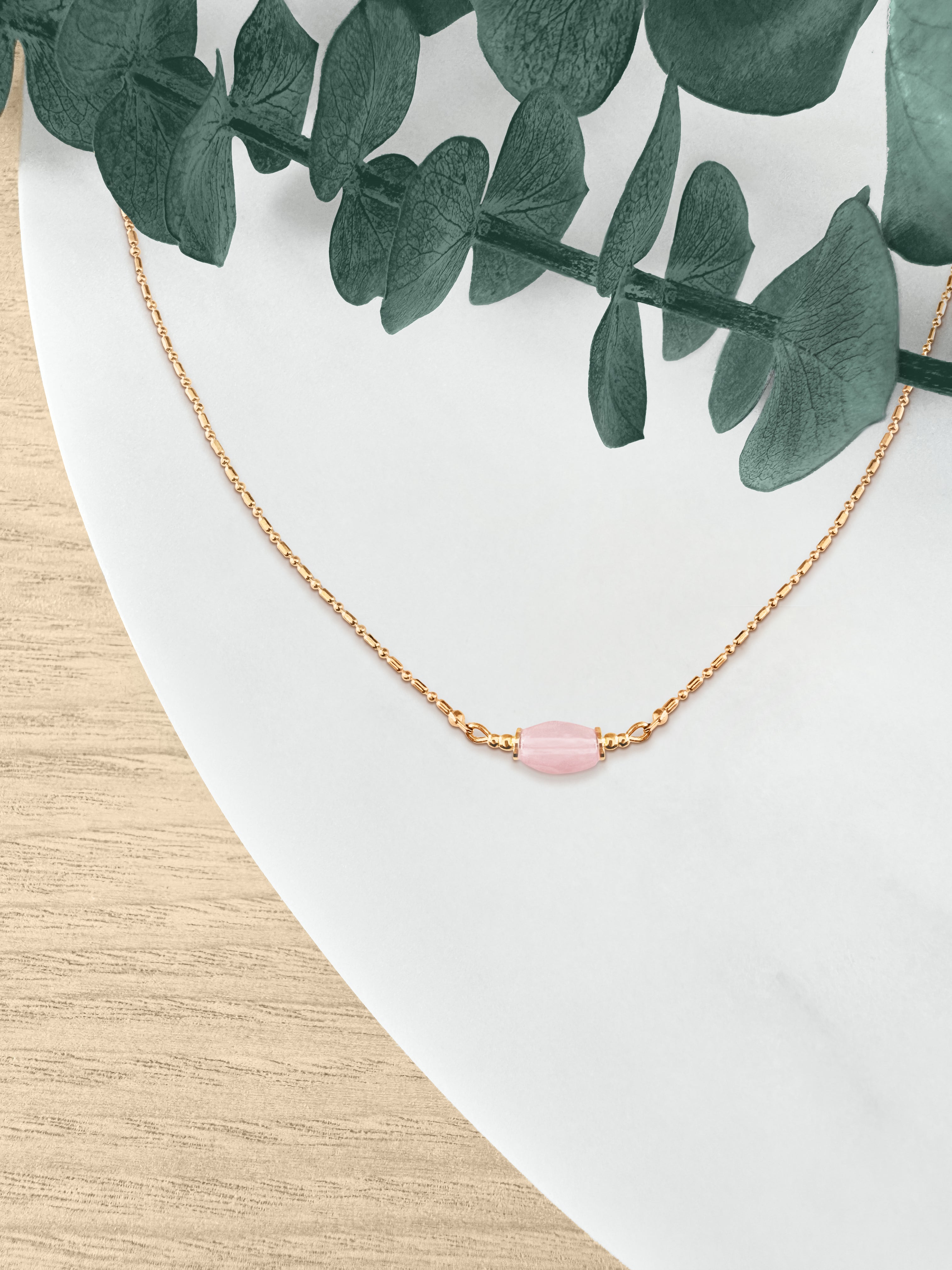 Le collier "JUANITA" en plaqué or est orné d’une pierre naturelle de 9 mm. Disponible en Quartz rose, Tourmaline ou Aventurine, pour une touche colorée et délicate. Lumineux et plein de charme, il apporte une note douce et moderne au quotidien, à porter seul ou en accumulation.